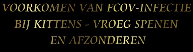 FCoV-preventie bij kittens staat bekend onder de "vroeg spenen en afzonderen" techniek, want dat is eigenlijk wat je doet. Kittens zijn beschermd tegen FCoV-besmetting door de antistoffen die zij binnen krijgen met de moedermelk. Wanneer deze verminderen, worden de kittens vatbaar voor FCoV-besmetting en het daaruit voortvloeiend risico op FIP. Vroeg spenen en afzonderen heeft het kattenfokkers mogelijk gemaakt te blijven fokken met actief besmette en virusuitscheidende moederdieren. In mijn eerste FcoV-onderzoek namen we waar dat 50% van de kittens die contact hadden met andere moeders dan hun eigen moeder en/of met kittens van andere nesten, besmet raakten met FCoV. Slechts een derde van de kittens die alleen met hun eigen broertjes en zusjes en hun seropositieve moeders werden gehouden, raakten besmet, hetgeen aangeeft dat ongeveer één op de drie seropositieve katten op een bepaald moment FCoV uitscheidde. Nesten kittens die gespeend werden vóór de leeftijd van 5-6 weken en volledig afgezonderd werden van alle andere katten en kittens in huis, werden allemaal negatief - zelfs als de reden voor het vroeg spenen en de afzondering het overlijden van hun moeder aan FIP was. De stappen voor het vroeg spenen en afzonderen van kittens zijn: 1.