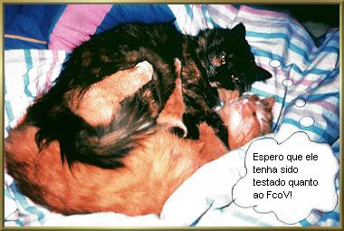 – poderá o meu cão infectar os meus gatos? Prevenção de transmissão de FCoV nas exposições de gatos No Reino Unido , 84% dos gatos em exposições têm anticorpos contra o FCoV. Já que, em media, um em três gatos com anticorpos a FCoV liberta o vírus, seria provável que 28% dos gatos nas exposições está a libertar o FCoV a uma dada altura. O FCoV é principalmente libertado nas fezes, por isso os gatos não deverão partilhar caixas de areia ou pás de fezes com gatos de outros lares. Juizes e veterinários deverão desinfectar as mãos e mesas entre o manuseamento de cada gato: lembre-se que alguns gatos numa fase inicial da infecção libertam FCoV brevemente na saliva. Prevenção da transmissão de FCoV no acasalamento Obviamente é mais sábio acasalar apenas com gatos com titragem de anticorpos zero com outros gatos livres de FcoV e gatos com anticorpos com outros gatos com anticorpos, daí o registo de acasalamento testado quanto a FCoV para ajudar os criadores a encontrarem-se uns aos outros. No entanto, por vezes os criadores têm razões para querer fazer um acasalamento arriscado (dos seus gatos!!). Nestas circunstancias, é melhor proceder a um acasalamento controlado, ou seja onde a fêmea e macho não cheguem a viver juntos por um dia ou dois (e por isso, tão importante para a transmissão do FCoV, não partilhem, caixa de areia) mas sejam apenas postos juntos pela duração do acasalamento em si. Claramente, o gato que era antes negativo deve ser testado para anticorpos 14 dias após o acasalamento para descobrir se ela ou ela ficou infectado apesar das precauções.