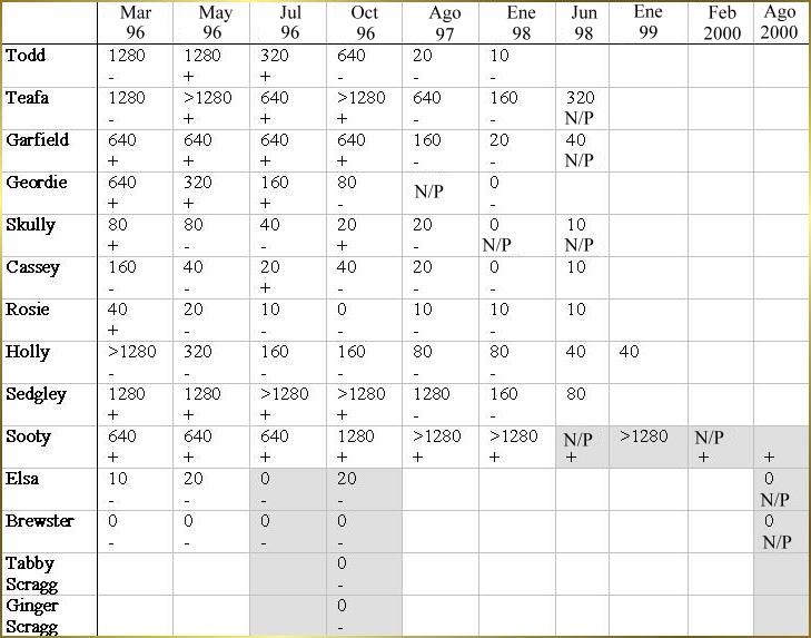 Tabla 1. Un hogar donde habitan gatos, en el cual se ha logrado erradicar con éxito la infección de CoVF, aislando los gatos que habían eliminado la infección de aquellos que aún excretaban el virus. Los casilleros sombreados indican el momento en el que un gato era trasladado a otra casa. Los números indican el nivel de anticuerpos de cada gato. + = resultado positivo de RT-PCR de heces o cánula rectal. - = resultado negativo de RT-PCR de heces o cánula rectal. N/P = No practicado
