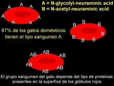 ¿Que son los grupos sanguíneos felinos o tipos de sangre? Nuestra sangre se compone de glóbulos rojos, glóbulos blancos y plasma. Los glóbulos rojos transportan oxigeno y su bienestar es esencial para la vida. Los glóbulos rojos, al igual que otras partes del cuerpo, están compuestos de proteínas. Las proteínas pueden ser reconocidas y destruidas por el sistema inmunológico del cuerpo. El gato tiene, esencialmente, dos grupos de sangre: A y B (aunque hay un tercer grupo muy poco frecuente llamado AB que es una combinación de los dos primeros grupos). Las proteínas de los glóbulos rojos son A en un grupo y B en el otro (ver gráfico 1). De hecho, las proteínas en la superficie de los glóbulos rojos de tipo A y B tienen muy pocas diferencias, pero el sistema inmune si puede detectar esa pequeña diferencia.