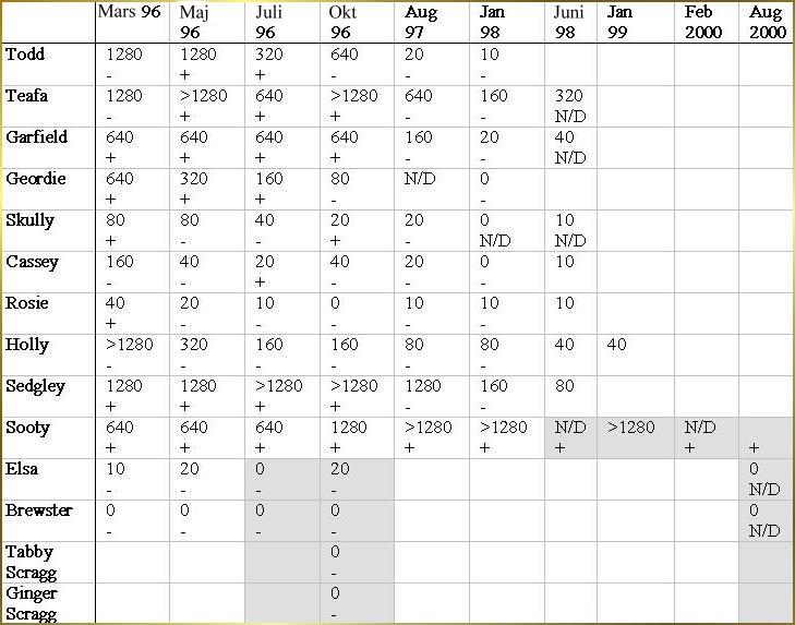 Tabell 1 visar ett exempel på ett hushåll med katter hos Carol, Ann och Simon Quinn, vilka lyckades eliminera FCoV-smittan. Katterna testades för antikroppar och deras avföring testades regelbundet med RT-PCR-metoden. Katter som slutat utsöndra FCoV och vilkas antikroppsantal höll på att minska till under 40 skildes av från de andra katterna. Lyckligtvis var Carol i färd med att lämna huset och kunde ta 4 negativa katter med sig till sitt nya hem. Andra kattälskare har lyckats hålla isär smittade och osmittade katter i ett och samma hus. I augusti 1997, 17 månader efter att FCoV-smittan upptäckts, var bara Sooty fortfarande smittad. Ann flyttade Sooty till sovrummet för total isolering från de andra katterna. I januari 1998 började det stå klart att Sooty var en FCoV-bärare och eftersom hon var olycklig i sin isolering i sovrummet verkade det troligt att hon skulle behöva avlivas. Till all lycka gick familjen Quinn med på att ge henne åt mig (mina egna två katter hade dött ett par månader tidigare och jag hade inga katter). Fem år senare bor Sooty fortfarande hos mig och utsöndrar fortfarande FCoV. Hon är en frisk bärare av FCoV.
